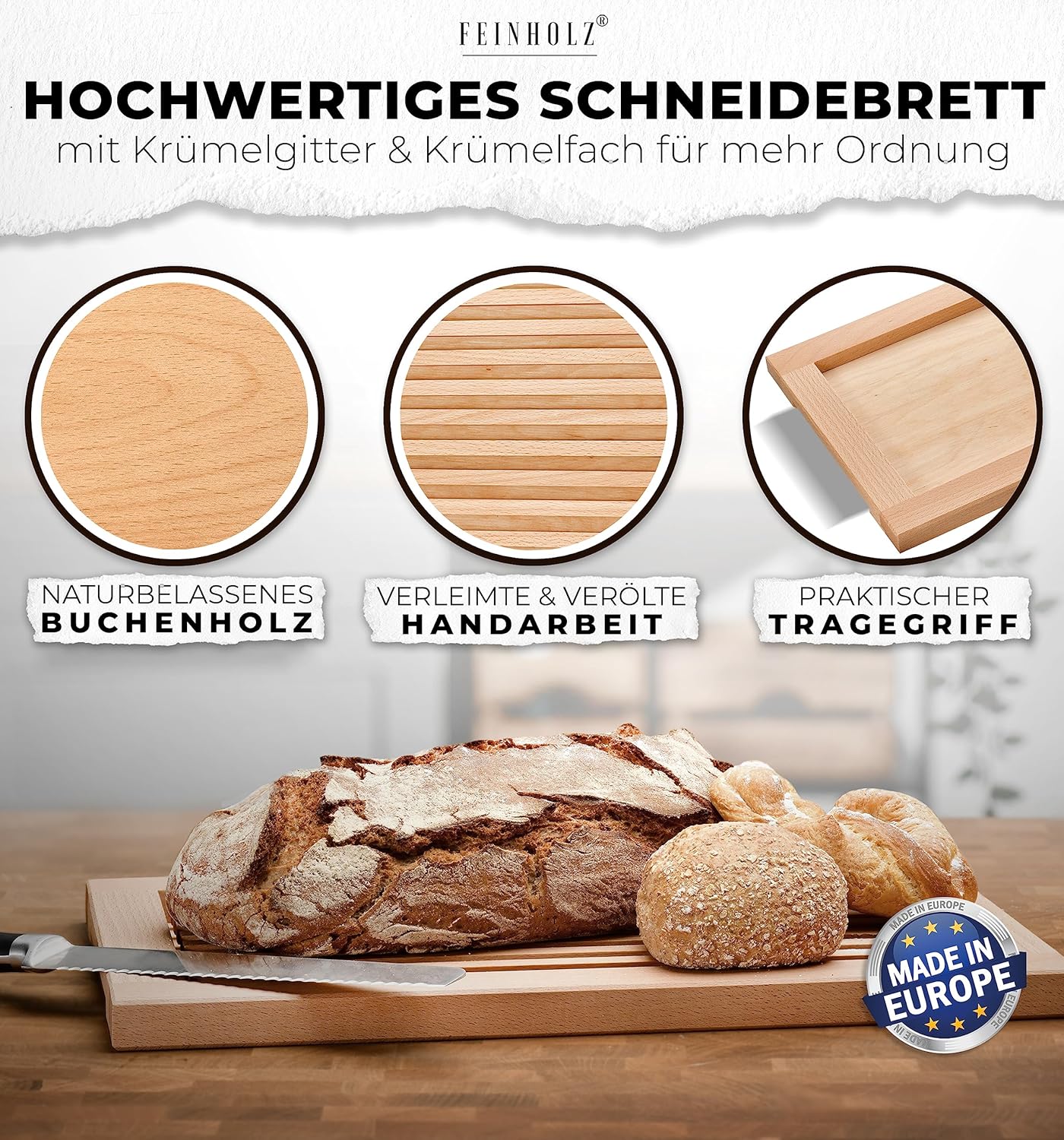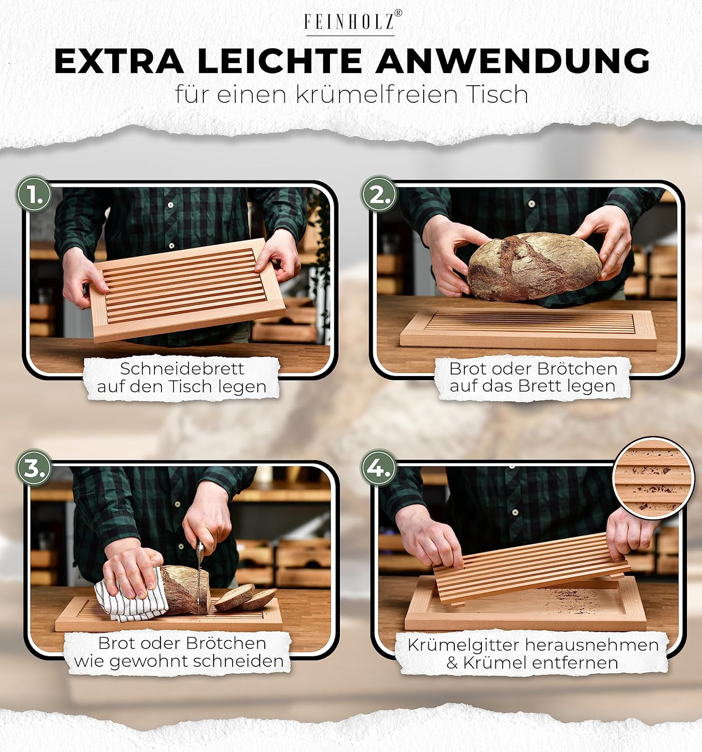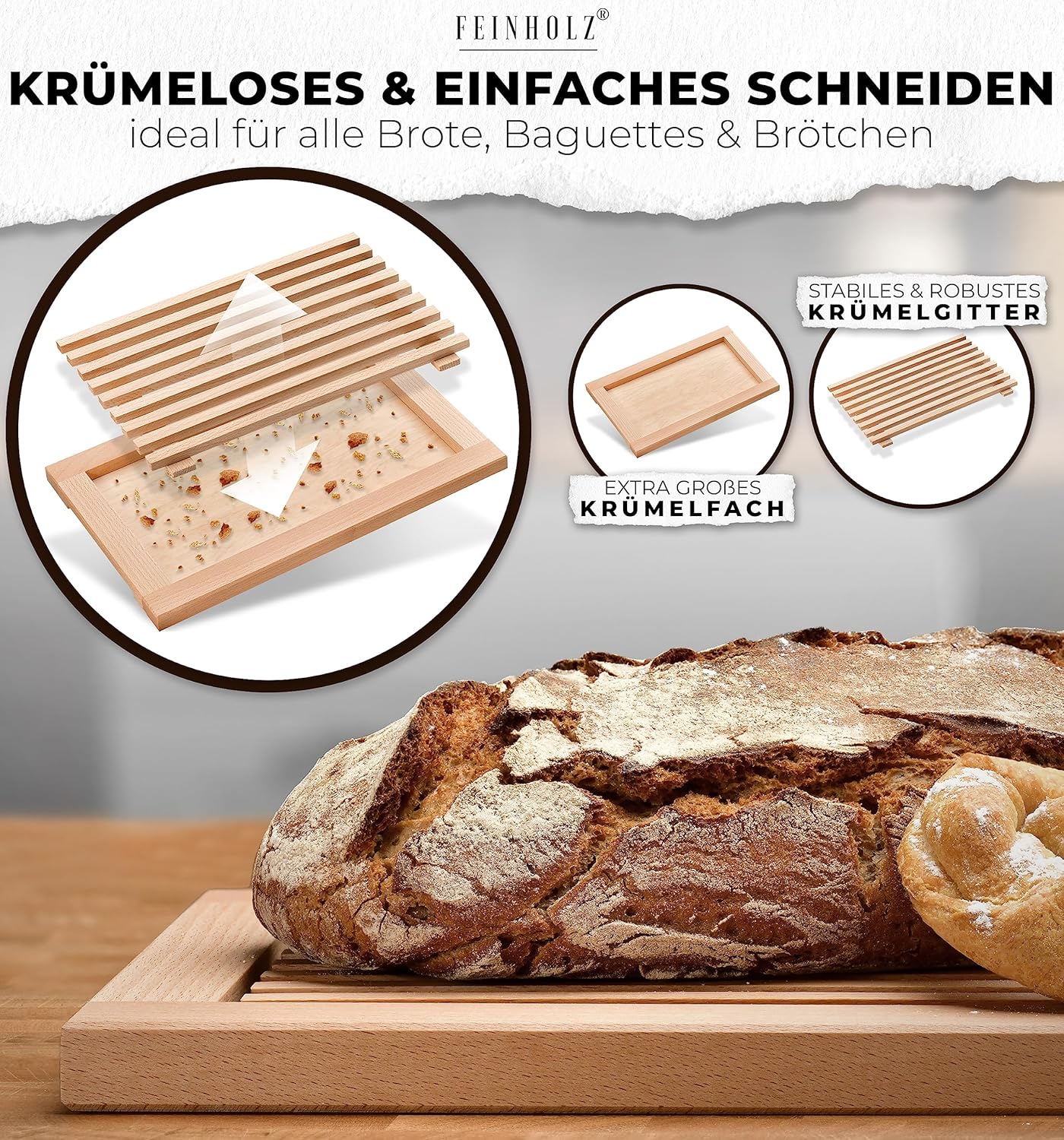 Dieses Brotschneidebrett aus massivem Buchenholz wurde für das saubere Schneiden von Brot und Backwaren entwickelt. Die integrierte Krümelrost-Konstruktion sorgt dafür, dass beim Schneiden entstehende Krümel durch die Schlitze in eine darunterliegende Auffangschale fallen. Dadurch bleibt die Arbeitsfläche sauber und die Krümel können einfach entfernt werden.